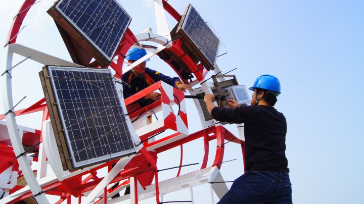 携帯電話の電源となる耐水性の太陽電池を取り付ける長谷川大介と戸田康一。