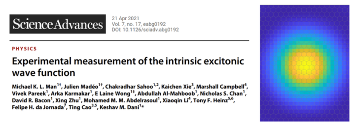 - Apr. 21: Our work on imaging the distribution of the electron around the hole in an exciton was published in Science Advances.