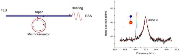 Figure 2 Left: The scheme of a homodyne detection setup for measuring the mechanical spectrum of a microresonator.  Right: The experimental curve is the noise spectrum of a 40 μm diameter microsphere. The peak at 90.2 MHz is the radial breathing mode of this microsphere and the inset is the corresponding vibration shapes from COMSOL simulation.