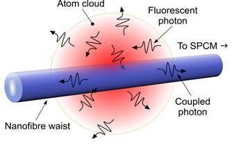 Figure 4: Schematic of the atom cloud overlapping the nanofibre, illustrating the coupling of fluorescence photons to the guided mode of the fibre.