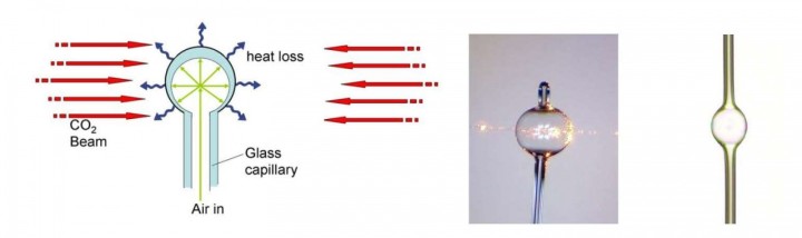 Figure 5 Left: Schematic of microbubble fabrication. A glass capillary is heated with a CO2 laser beam and then blown out by compressed air to make a thin shelled microbubble. Right: Two types of microbubble, one with a closed end and one with two openings which allows fluid to be passed through the core.