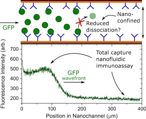 Reduction of fluidic and reaction systems to nanometer length scales promises to result in a set of rich and exciting physics of both academic and technological importance. Our experiments observed the capture of green fluorescent protein (GFP) by an anti-GFP capture antibody tethered to the walls of glass channels of rectangular cross sections with heights of 200~nm or 580~nm. By reducing the channel height to 200 nm, we are able to operate our immunoassay device in the convection limited system (see Fig. 5). The system exhibits wavefronts of the target analyte that propagate along the length of the nanochannel at a velocity much slower than that of the carrier fluid. Our analysis suggests that nanoconfinement results in a preference toward binding of the target analyte with the surface-grafted capture antibody, as evidenced by an apparent reduction in the equilibrium dissociation constant. Our findings motivate the advancement of new biomedical and chemical synthesis technologies by leveraging nanoconfinement effects, and demonstrate a useful platform for studying the effect of nanoconfinement on chemical systems.