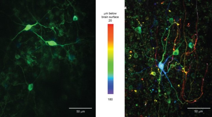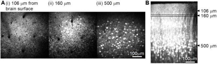 Calcium is an important second messenger in neurons and an increased calcium concentration is correlated with neuronal activity. For this reason we use a genetically encoded calcium indicator, called G-CaMP, in secondary motor cortex (M2) of mice to detect neuronal activity. When a neuron becomes active, G-CaMP will become brighter. Figures show the two-photon image of neurons labeled with G-CaMP in an anesthetized mouse, indicating that neurons in layer 2/3 were successfully labeled. In preliminary experiments we conducted a simple Pavlovian conditioning task and functionally imaged neuronal activity in awake behaving mice. In this task, mice get a water reward after a tone presentation. We found that layer 2/3 neurons in M2 showed correlated activities with tones, licking, and locomotion, and that such characterized neurons were homogeneously distributed in space.