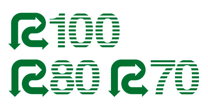 再生紙のロゴはその製品が再生紙から作られていることを意味します。ロゴのデザインは、アルファベット大文字の「R」の横に含まれている再生紙の割合が数字で表示されるというデザインです。