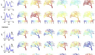 One of the most striking examples of strong interaction between chemical and electrical signaling occur in Purkinje cells, one of the largest neurons in the brain. Here, calcium bursts of varying shape, duration and amplitude affect the connection strength to other neurons and also the electrical output of the cell. The driving force behind this variability was, however, a mystery until now. “Experiments have their limits, so to study this in detail required a computational approach, the tools for which were simply not available. For this reason we developed software called STEPS, one of the most powerful and detailed molecular simulators around,” said Iain. Whereas deterministic approaches yielding clean results without “noise” have historically been applied to study such systems, STEPS reaches a higher level of detail by including stochasticity – the inherent randomness of molecular movement and interaction – to gain new insights into such systems. Key to the Journal of Neuroscience study was development of a novel approach to accurately calculate electrical signaling in complex neuronal structures, which allowed Iain and Haroon to develop one of the most detailed molecular models of cellular signaling ever studied. This paper shows that stochastic activation of ion channels and the variability of calcium levels in space and time give rise to the variable shape, duration and amplitude of calcium bursts.