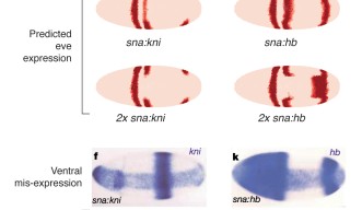 One of the genes essential for segmentation in the fly is called even skipped (eve). At an early stage of development, the eve gene can be detected as seven stripes around the embryo. Like all genes, its expression is repressed or activated by proteins called transcription factors. Since previous models could not explain the expression of the eve gene in the entire embryo of about 6,000 cells, it was assumed that some important factors had not been found and were not integrated into the calculation. Dr. Ilsley, on the other hand, constructed a simpler model that predicts expression in every cell using transcription factor concentration data from the Berkeley Drosophila Transcription Network Project. Dr. Ilsley’s approach enables calculations for the entire embryo for the first time. In this study, calculations were focused on two regions of regulatory DNA controlling stripes 2, 3 and 7. The expression of eve was predicted with considerable accuracy. The model also correctly predicts the effect on expression of the eve gene resulting from mutation or misexpression of its regulating transcription factors (Figure 1).