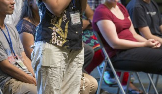 The ceremony ended with a joint performance from local drum group Ryusei Daiko and singing group Sansanar. The halls of the OIST auditorium rang with the repeated call “Mor-e!” which means “Dance!” in the Okinawan dialect.