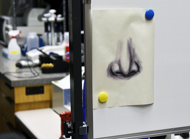 A second room, midway through completion, houses tables with similar configurations, along with microscopes. A powerful infrared laser sits atop a platform. These tools will allow the researchers to study the brain under particular conditions, controlling crucial variables, such as the percentage of the smell solution they use, the number of odorants introduced, and the percentages of each in a combination.