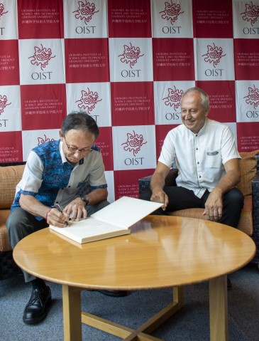 After signing the OIST “golden book”, Mr. Tamaki gave a short speech in which he expressed his gratitude to the late Prof. Sydney Brenner for his achievement in helping establish OIST, and proposed the creation of a memorial bust of the former President of the Okinawa Institute of Science and Technology Promotion Corporation (OIST P. C., 2005 - 2011).