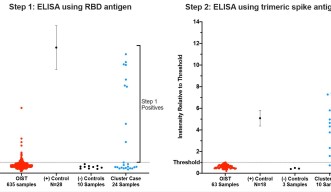 The first step used one part of the spike protein to see if there were any antibodies in the sample that would bind to it. This was highly sensitive but not very specific to this virus, meaning that it could detect low levels of antibodies, but they weren’t necessarily from SARS-CoV-2.
