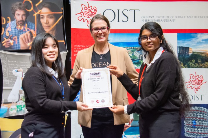 This was the first time that a team from the Zion Christian Academy International, an international school located in Chatan Town, participated in SCORE!. The team consisted of 2nd year Mayusha Keerthi and 3rd year Gabrielle Ann Miyagi looked at the air-purifying ability of moss and conducted a scientific experiment to verify its properties. The team then presented their idea of an environment-friendly air purification device that utilizes this property of moss. The judges selected the team for first prize for their outstanding presentation skills, scientific insight, as well as the project’s sustainability, and practicality.