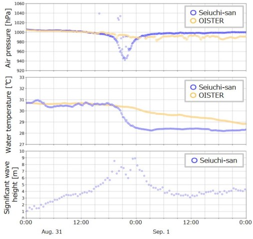 Air pressure is directly related to intensity of a typhoon, and Seiuchi-san was able to capture sudden, rapid changes in air pressure in the violent wind region of the typhoon. It was able to confirm the lowest pressure value at its closest approach to the typhoon, at approximately 20:00 on August 31. In contrast, OISTER made observations in the strong wind region, and was not able to recognize such drops (Fig. 1 top, Point (1)).