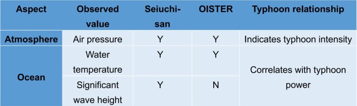 Seiuchi-san operated in the violent wind region, not less than 11 km from the typhoon center (with average wind speeds of 25 m/s or more), and OISTER operated in the strong wind region approximately 100 km from the center (with average wind speeds of 15 m/s or more). Both vehicles took atmospheric and ocean measurements simultaneously. The typhoon-related observations made are summarized in Table 1.
