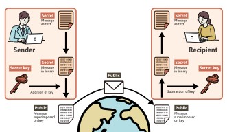 Confidential information is translated into binary before being superimposed onto a secret random encryption key by performing binary addition. The result is another random sequence of ones and zeros. Because this sequence is also random, nobody can find the confidential information hidden in it, even when analyzing the sequence. At this stage, the messages, also called cryptograms, can only be decoded with the matching key. That makes it possible to send the message safely even when using non-encrypted or public methods. Once the recipient gets the cryptogram, they can recover the confidential information hidden by subtracting the random sequence of the encryption key. Illustration: Kaori Serakaki/OIST