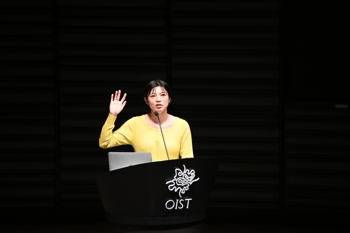 As the poster session drew to a close, the crowd was ushered back into the auditorium for the award ceremony. The five judges, which included OIST researchers, a start-up scientist, and experts from the Okinawa Prefectural Government, took the stage, and following a brief introduction by the senior judge Dr. Yohei Morita from OIST, announced the winners.