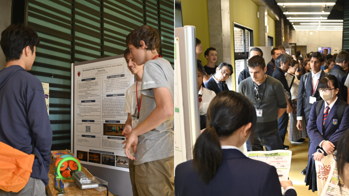 Following the last presentation, the poster session began in the adjoining conference center. The room was alive with chatter as high schoolers mingled with graduate students, teachers, and professors, and lively discussions about the realities of the scientific process flourished. Among the poster presenters were a pair of brothers from Okinawa Christian School International, who had spent their summer coming up with a solution to the pressing issue of plastic waste on beaches: a 3D-printed PET-bottle shredder mounted on a wheelbarrow. “Our first prototypes failed completely,” one of the brothers admitted with a grin. But the two persisted, and through trial-and-error they exemplified the creativity of the scientific process with an entrepreneurial flair.