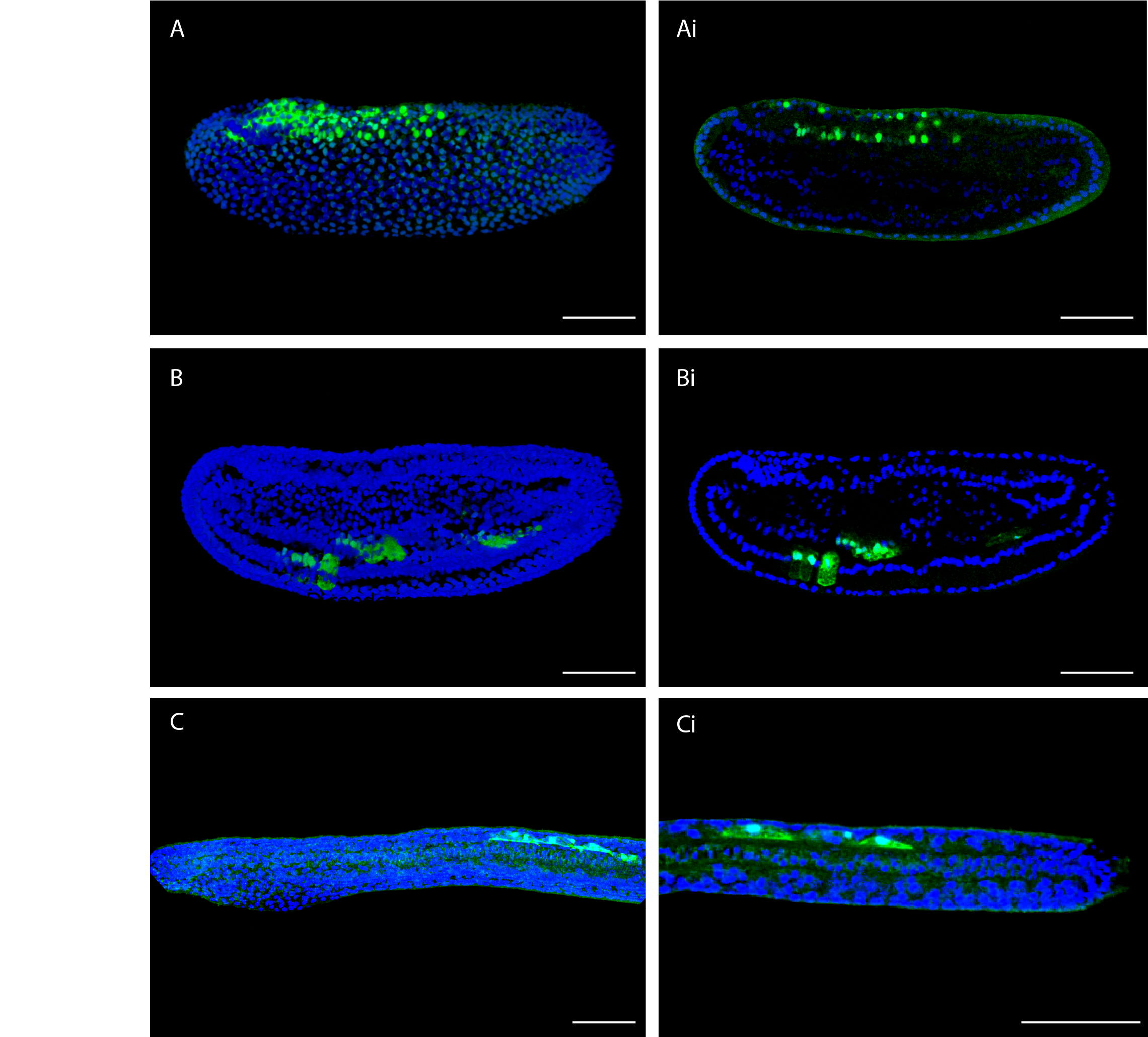 These “reporter” constructs depict how different regulatory elements drive gene expression in amphioxus embryos. Nuclei throughout the embryo are stained blue, while proteins whose expression is being modulated are shown in fluorescent green.