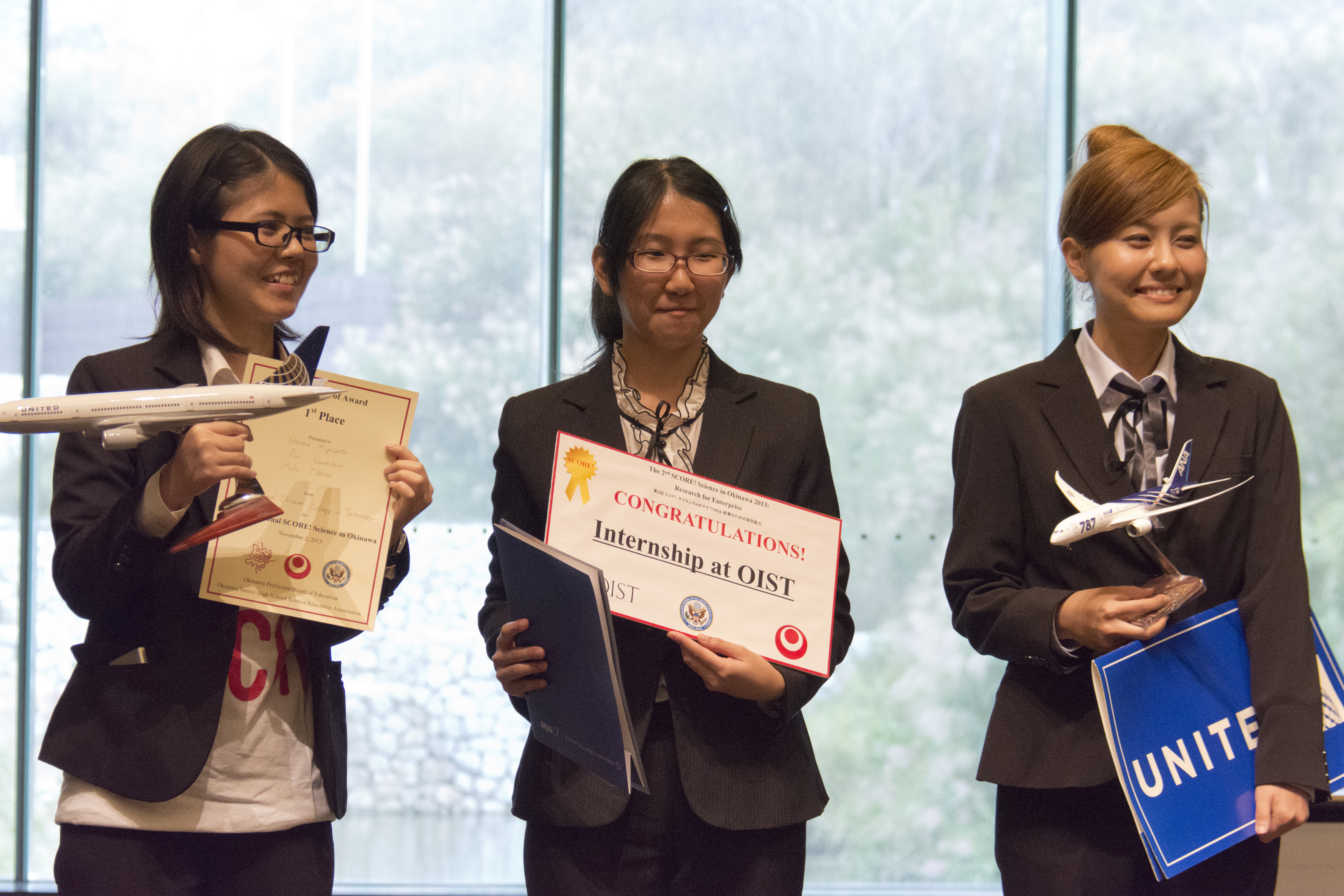 First-place winners Haruna Miyazato, Rui Yamashiro, and Mako Tibana from the Okinawa National College of Technology.