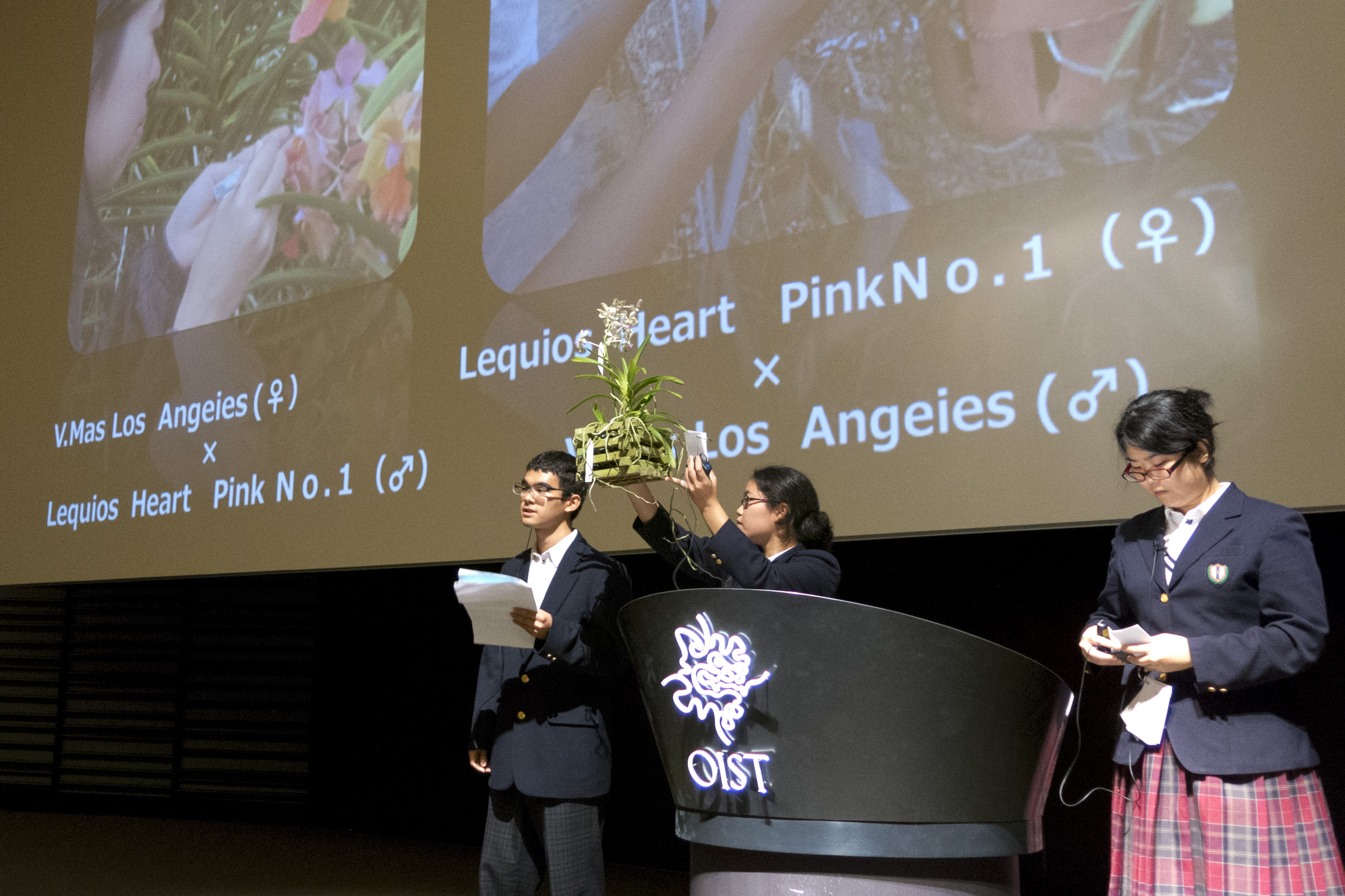 2nd Annual SCORE! third-place winners Nikawadori Miyu, Kikka Uezu, Yuma Umezaki of Okinawa Prefectural Chubu Agricultural High School.