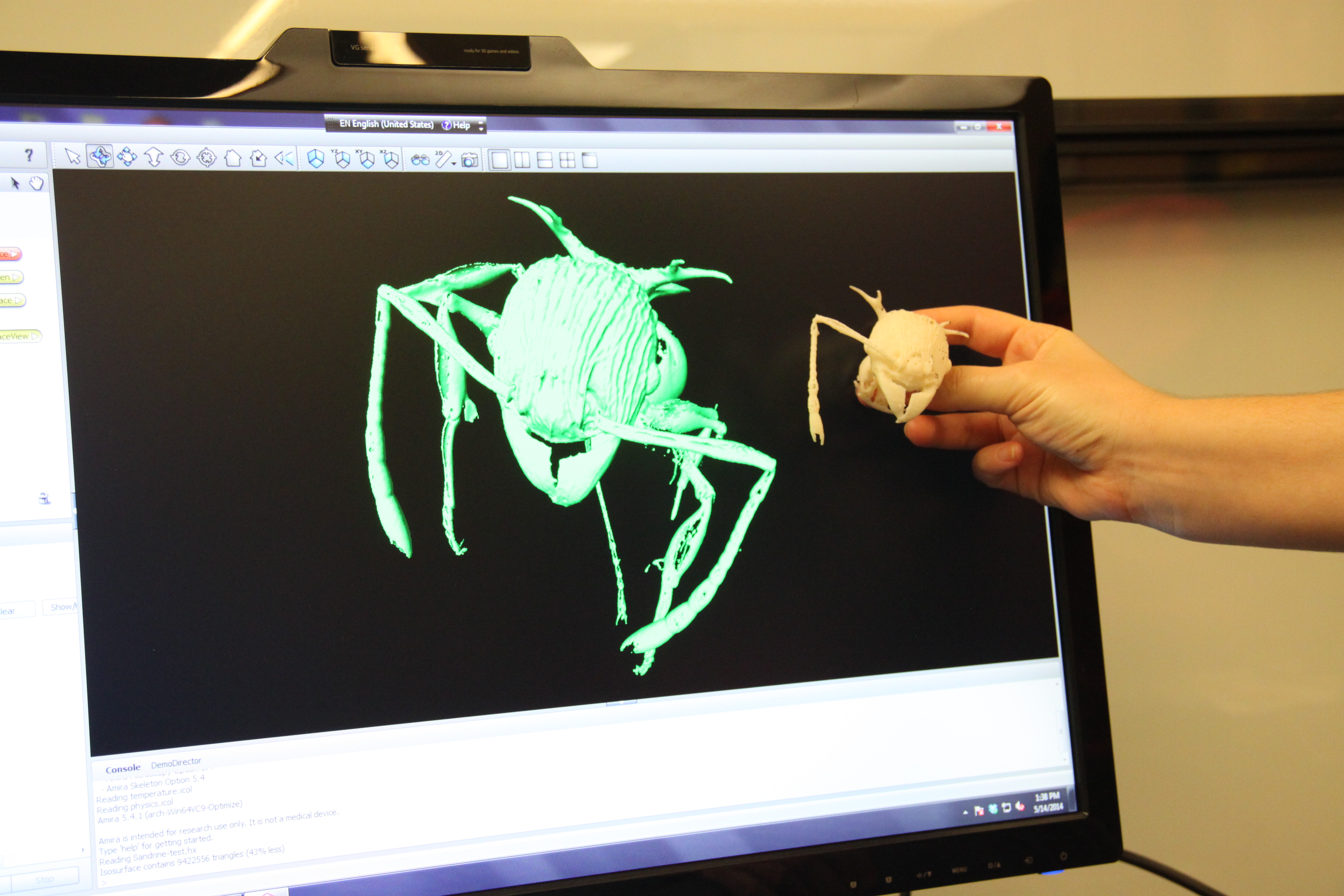 Burriel-Ha’s 3D model of the ant head and first segment next to the 3D image on the computer used to print it.