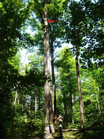 Researchers collected wild bees from the same forest in Ithaca, NY in 1977 and 2010, which allowed them to observe genome-wide changes over this time. The red arrow points to the bee nest in the tree.