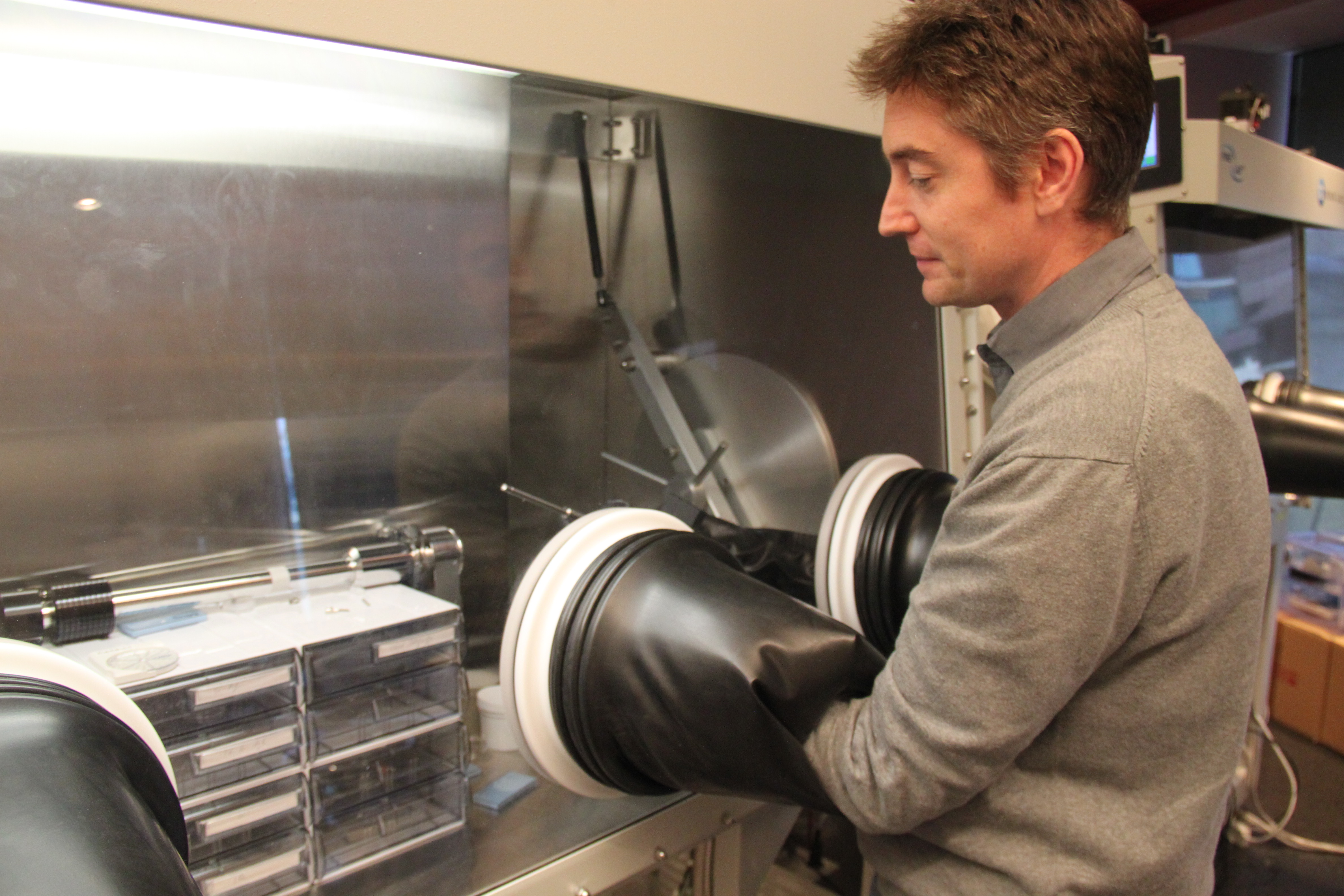Cathal Cassidy working in the glove box, about to load nanoparticles into the holder for transport.