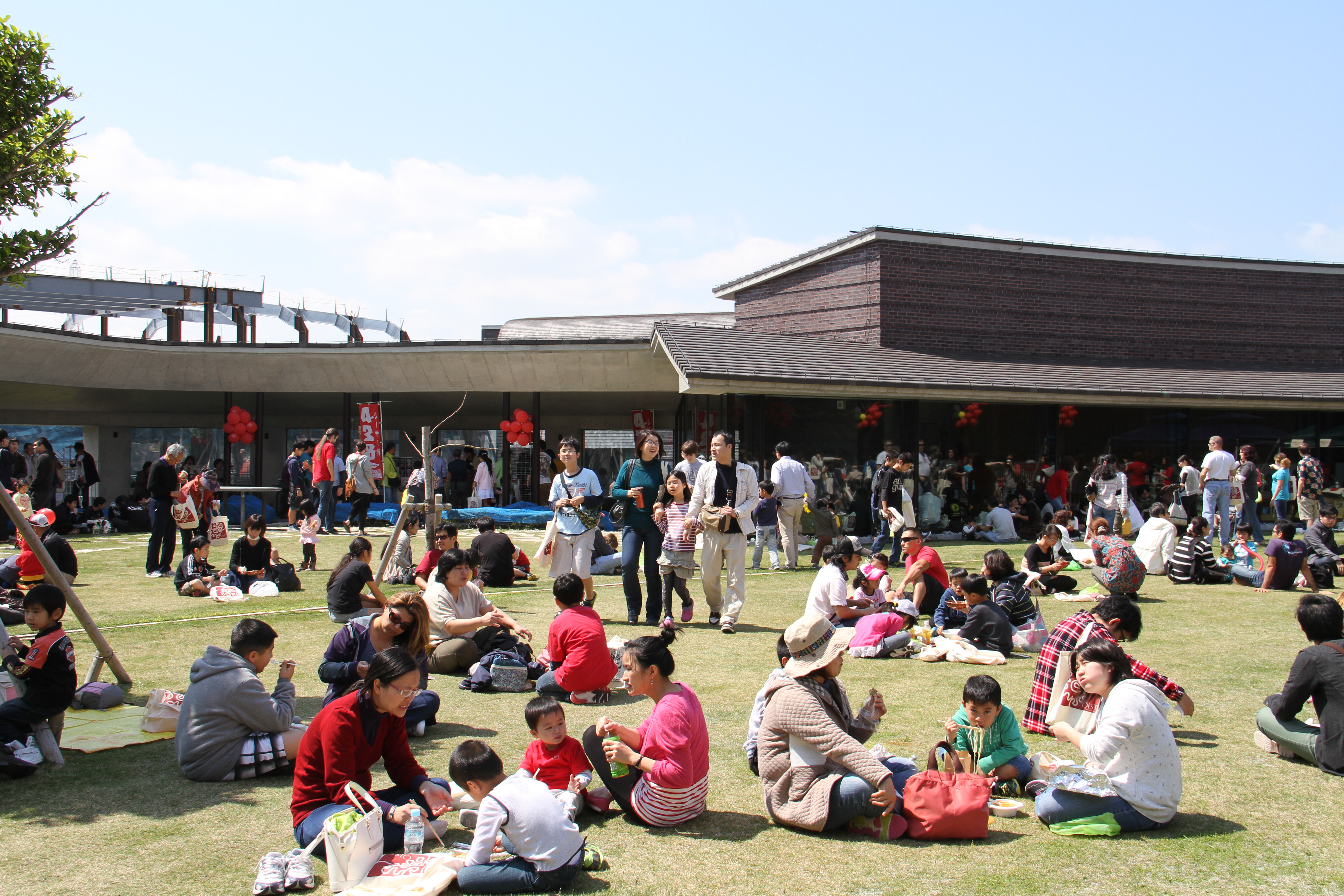 Visitors eating out on the grass in the Center Court. There were 20 food stalls.