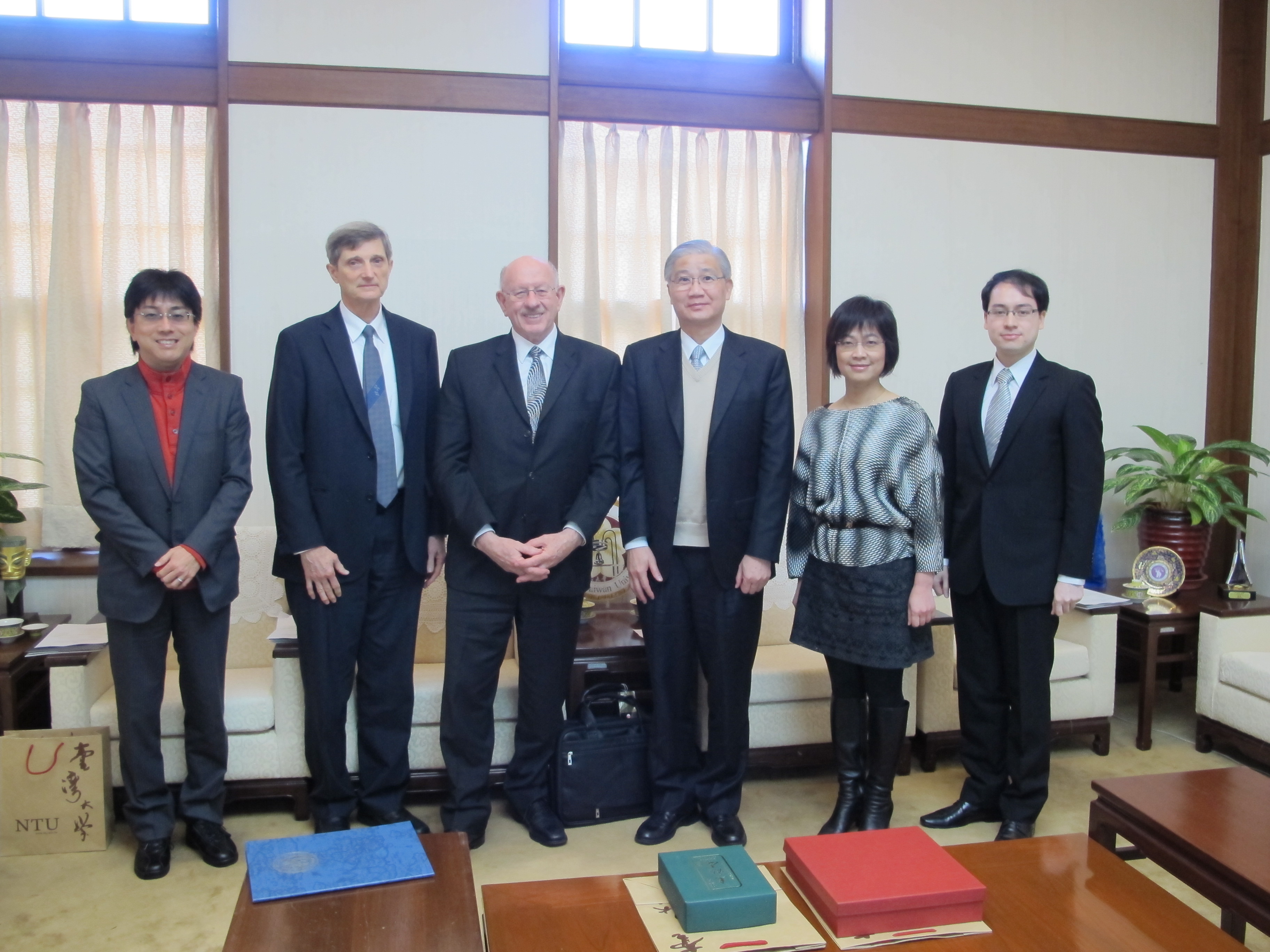 OIST Mr. Makoto Higasa (Academic Exchange Coordinator), OIST Robert Baughman (Provost), OIST Jonathan Dorfan (President), NTU Pan-Chyr Yang (President), NTU Luisa Shu-Ying Chang (Dean, Office of International Affairs), NTU Mr. Vivien Trividic (Project Manager).