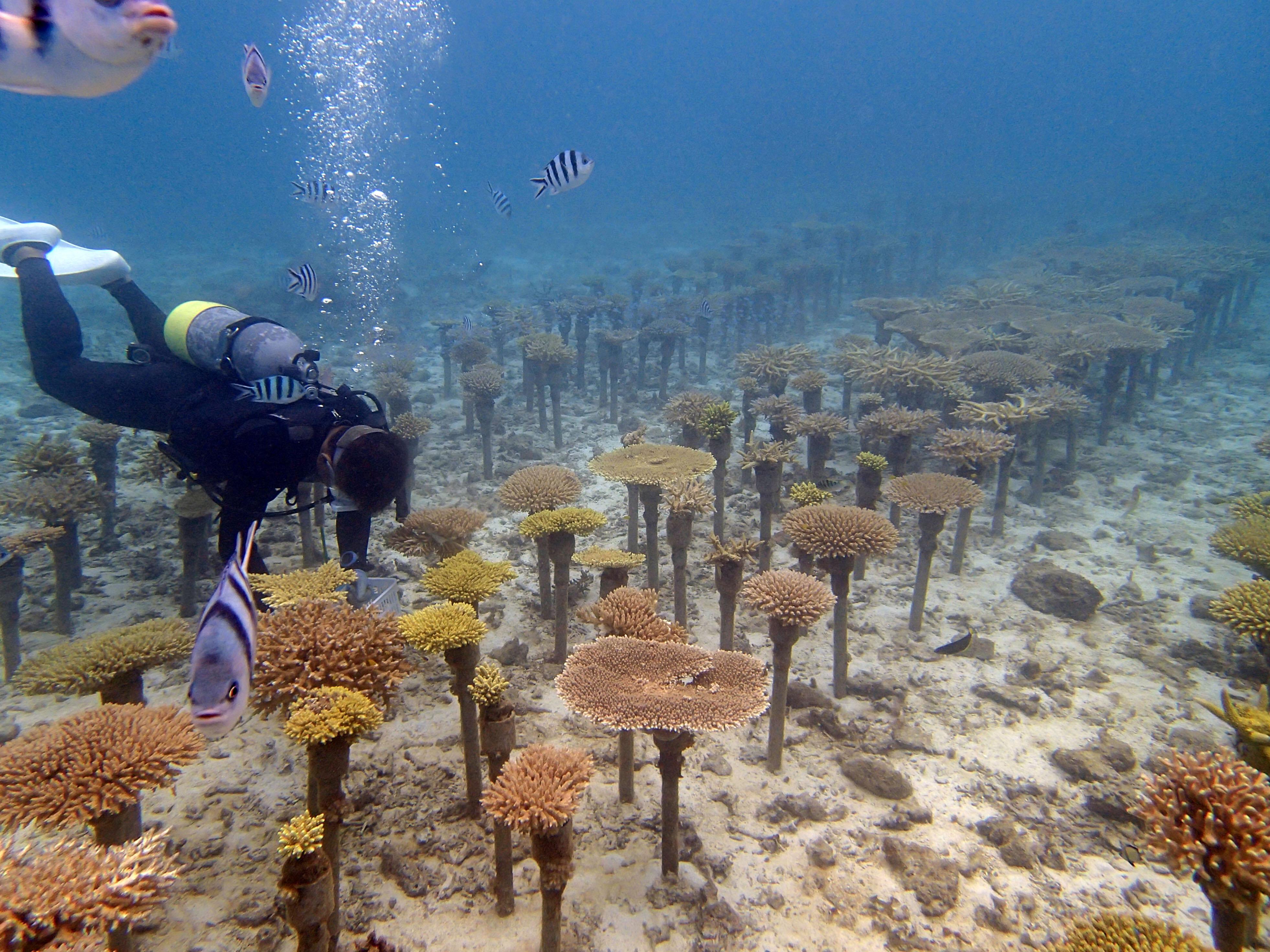 A coral nursery in Maeganeku, Okinawa. Corals are maintained on metal posts.