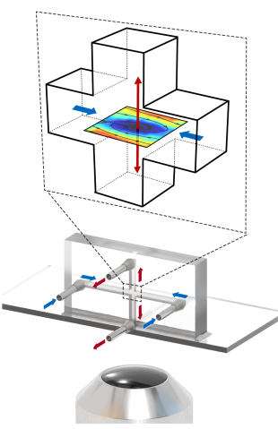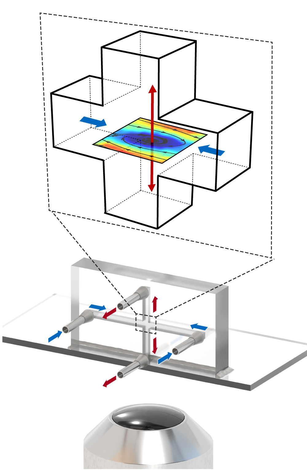 By mounting the microfluidic device on a microscope and adding microbeads, the researchers could visualize the vortex that formed at the cross section. The colored arrows indicate the direction of the flow inside the device.