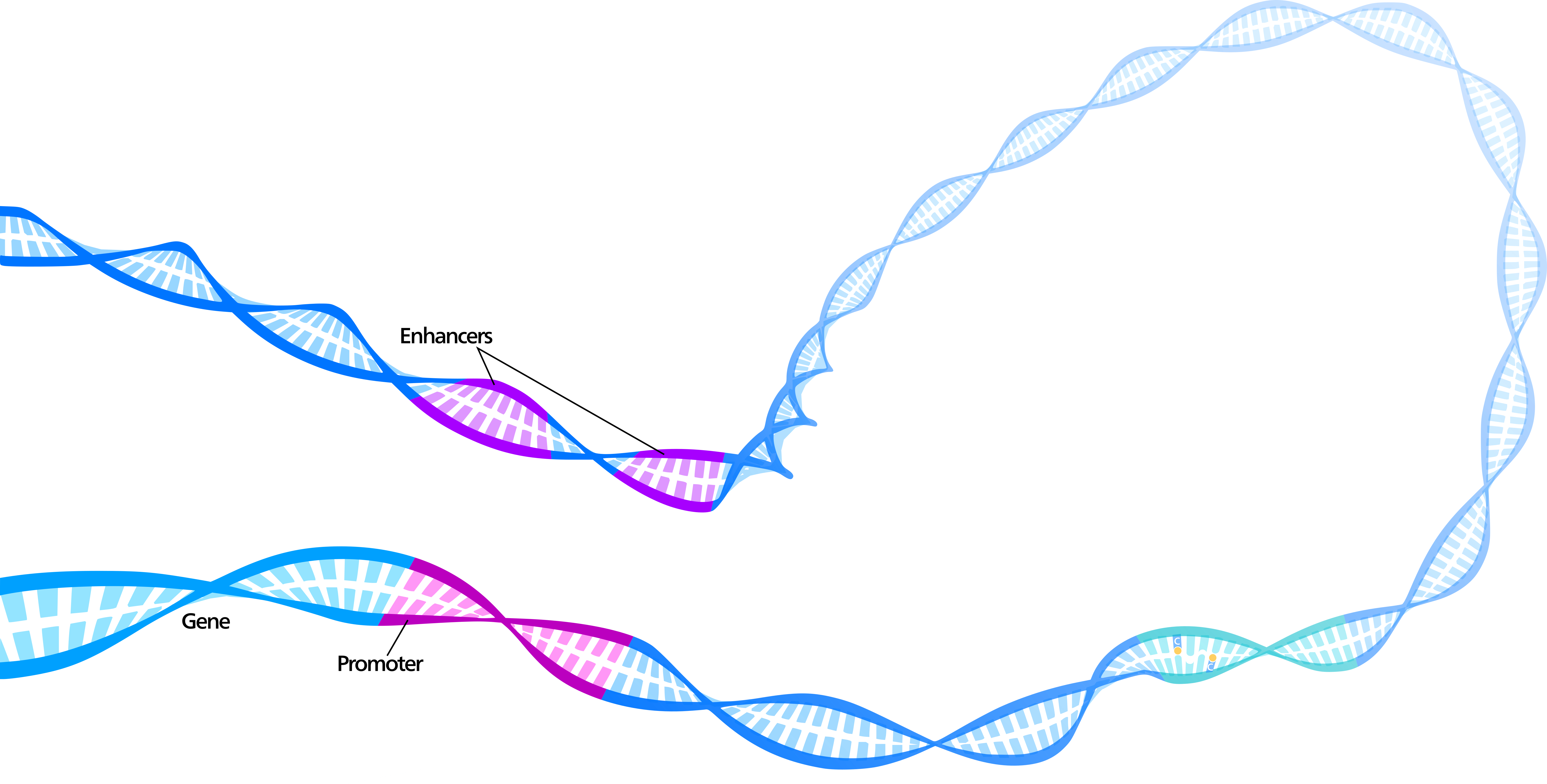 DNA looping can bring a promoter and a distant enhancer close together inside the nucleus. Photo courtesy of Kelvin Song.
