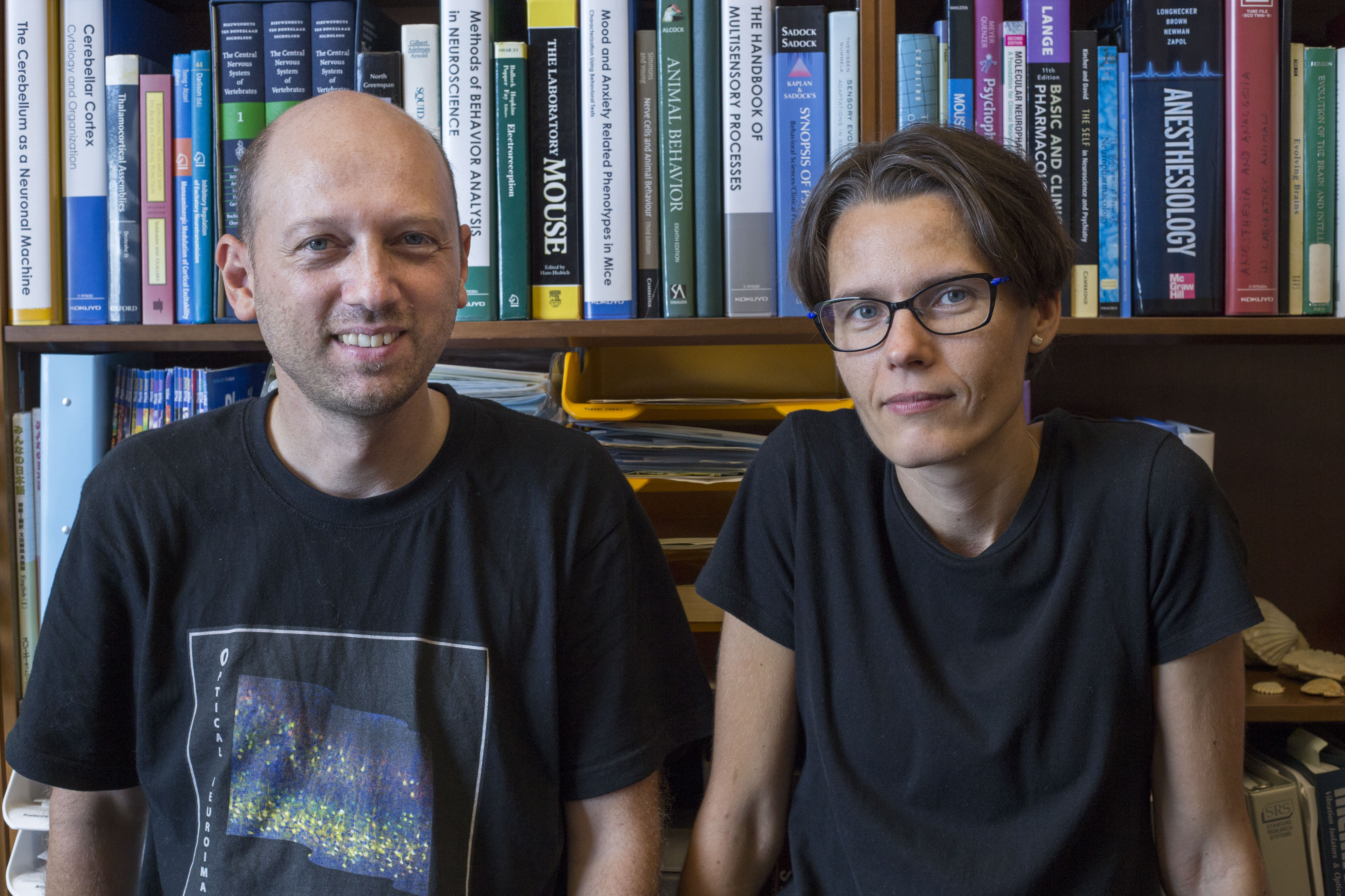Dr. Bernd Kuhn, left, and Dr. Sigita Augustinaite, right, stand in Dr. Kuhn’s office in the Optical Neuroimaging Unit at OIST.