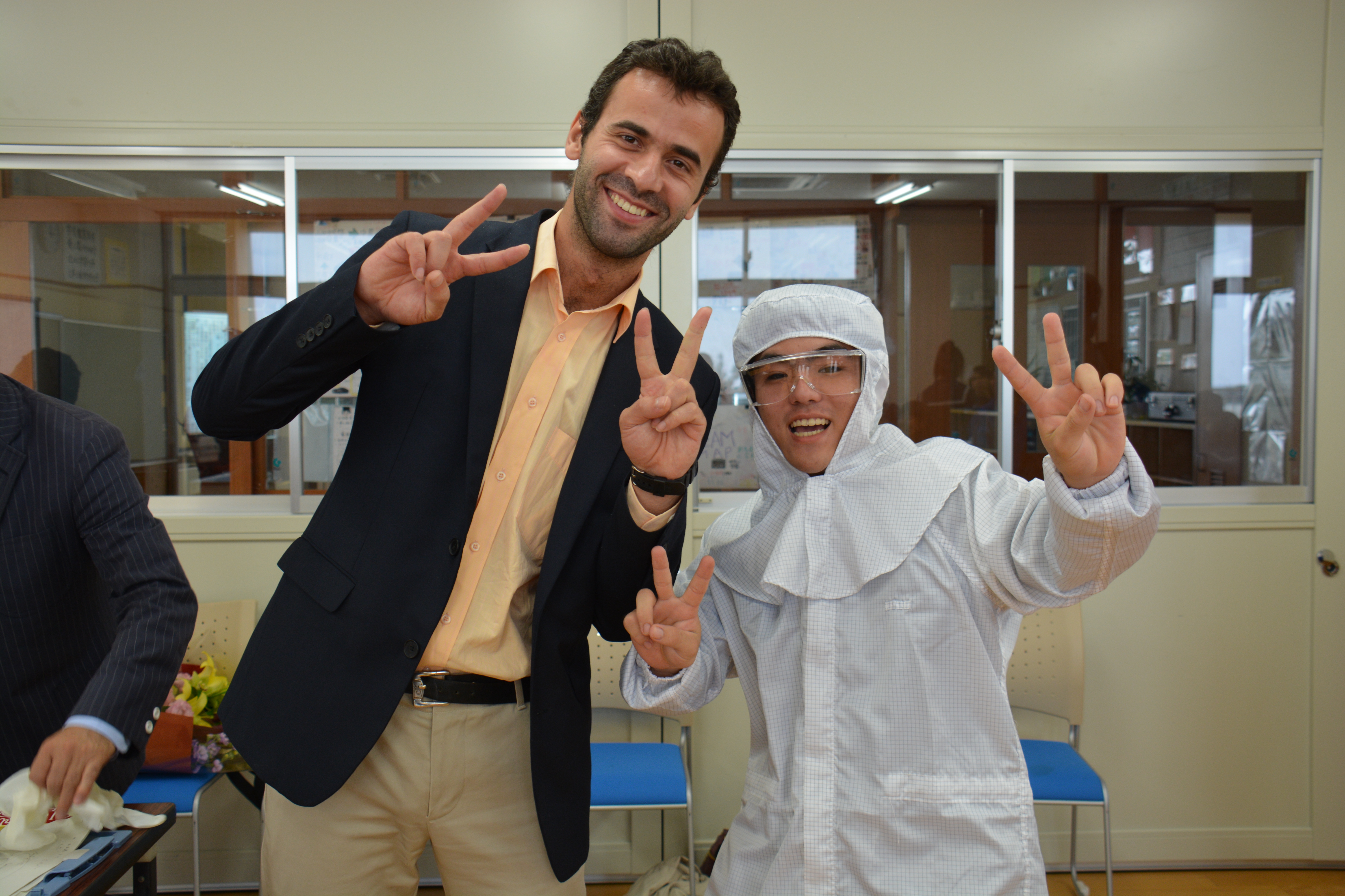 Dr. Gueorgui Nikiforov of the Energy Materials and Surface Sciences Unit with a student at Yamada JHS in Onna-son.