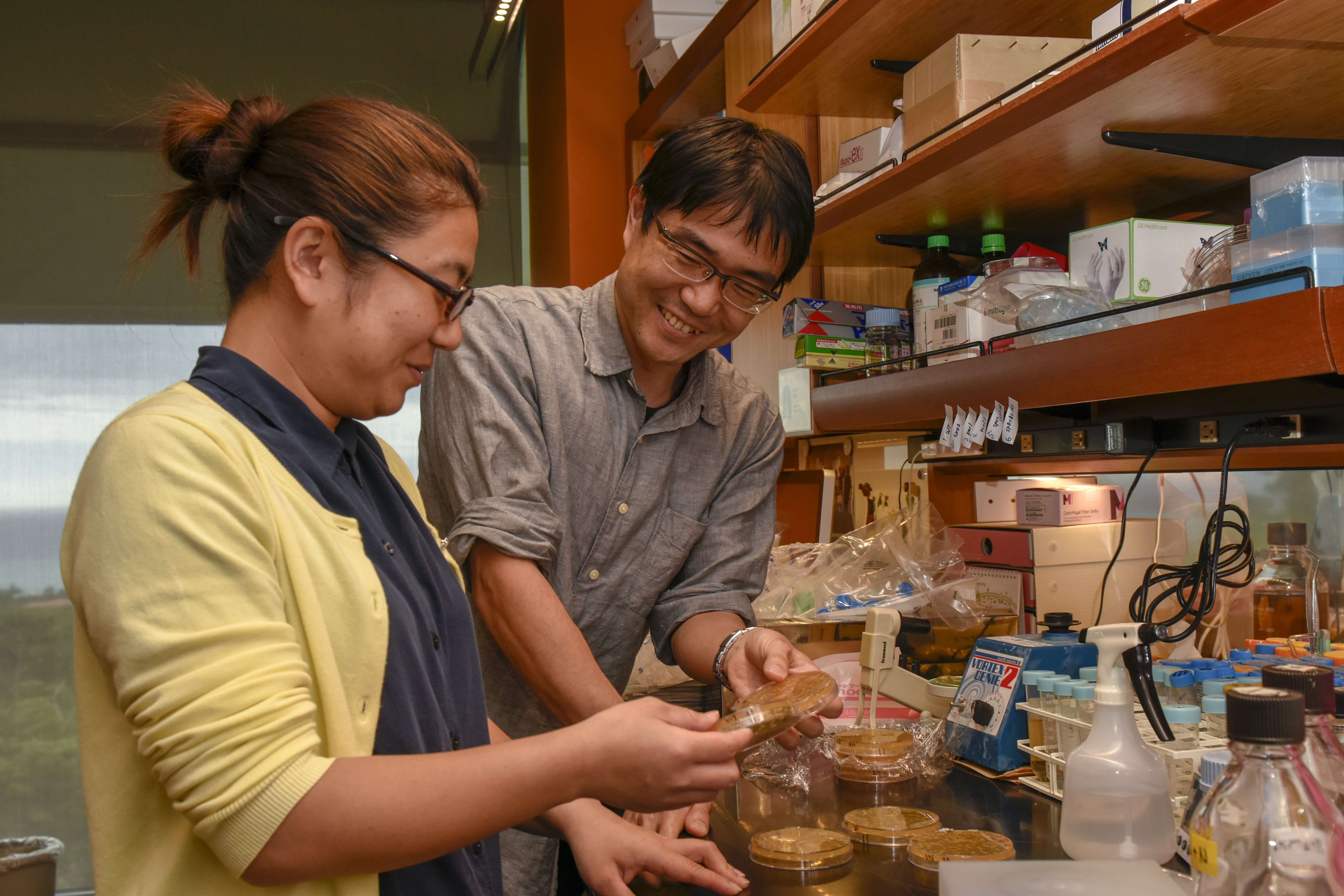 Dr Kenicki Sajiki (Right) and technician Yuria Tahara at work in the lab