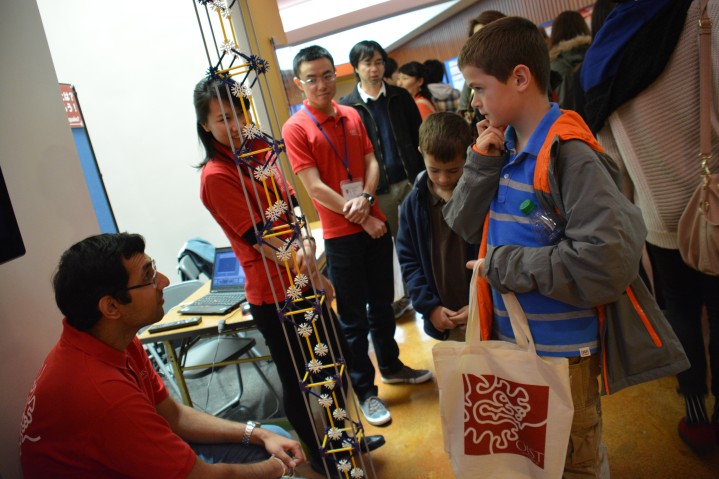 A young visitor puzzles out why one side of the building is stronger than another in an earthquake with the help of PhD student Ankur Dhar at 2015 Open Campus.