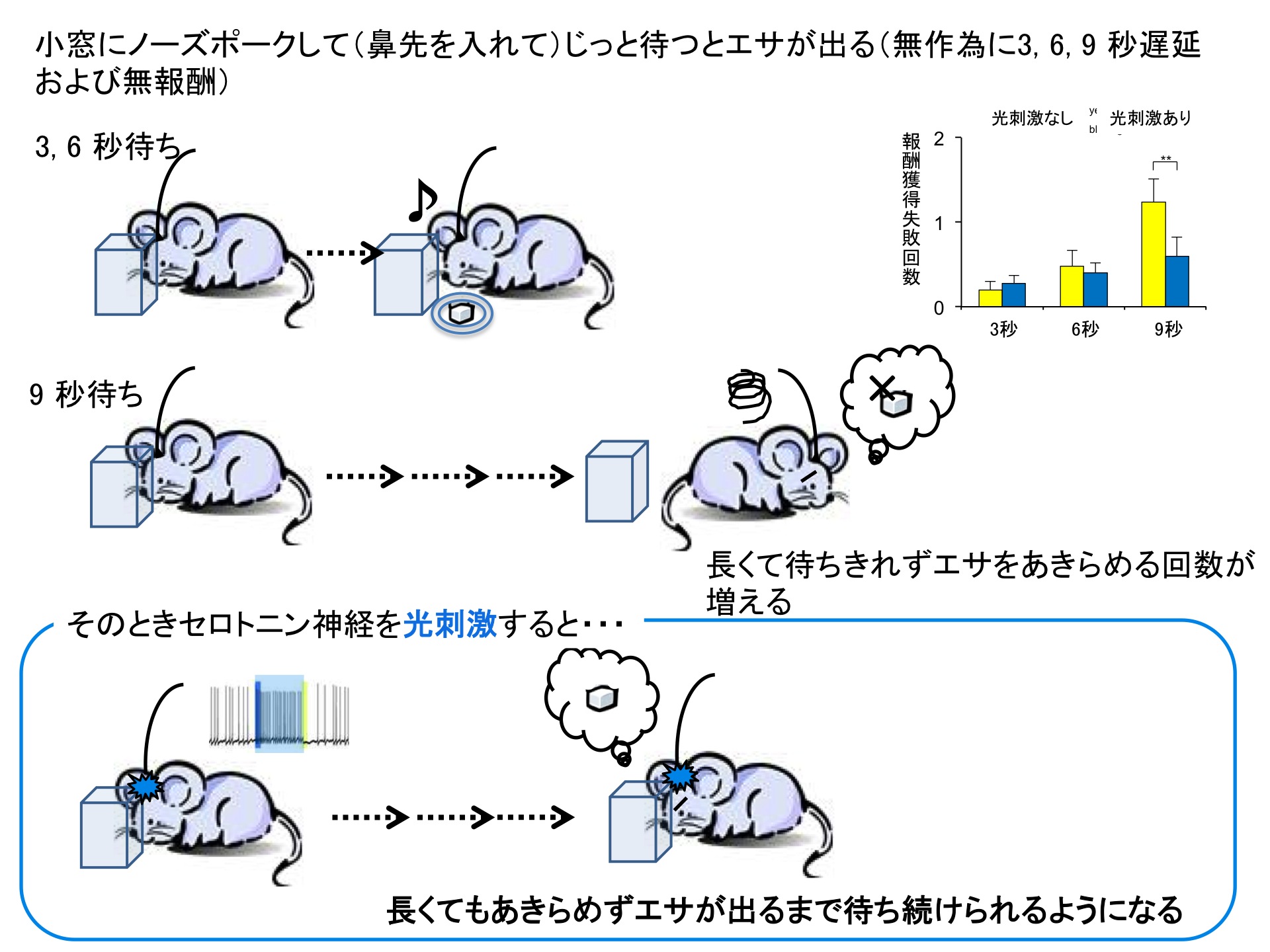 The mouse easily could wait for 3 and 6 seconds to receive delayed food. When the duration was 9 seconds, the failure in waiting significantly increased. When serotonin neurons were activated with light stimulation during the 9-second delay, the number of reward wait failures significantly decreased.