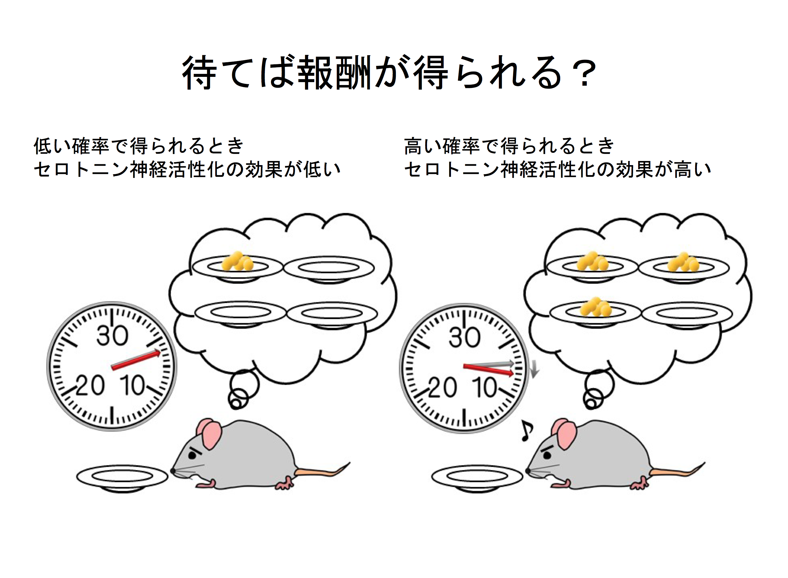 Figure 1: With a 25% probability of reward, the nose-poke time in no-food trials did not change even if serotonin neurons were activated (left). But with a 75% reward probability, the nose-poke time during no-food trials increased when serotonin neurons were activated (right).