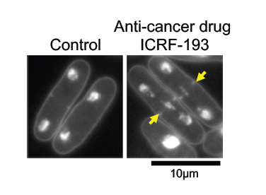 With DNA topoisomerase II (topo II) intact, DNA in fission yeast cells replicates normally and is split evenly between two daughter cells (left). When under the effects of anti-cancer drug ICRF-193, the DNA becomes tangled in the center of the parent cell, preventing its clean division.