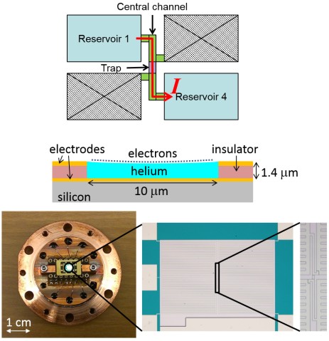 Images of the electron trap architecture used by the Quantum Dynamics Unit. Top: Schematic representation of the experiment. Current of surface electrons, induced by ac voltage applied to the electrode underneath Reservoir 1, flows between Reservoirs 1 and 4 through the central microchannel, as shown by the red arrow. Middle: Cross section of the central microchannel around the gate area. Bottom: Photograph of the microchannel device on a copper sample cell, with subsequent close-up photographs of the central channel and surrounding reservoirs.