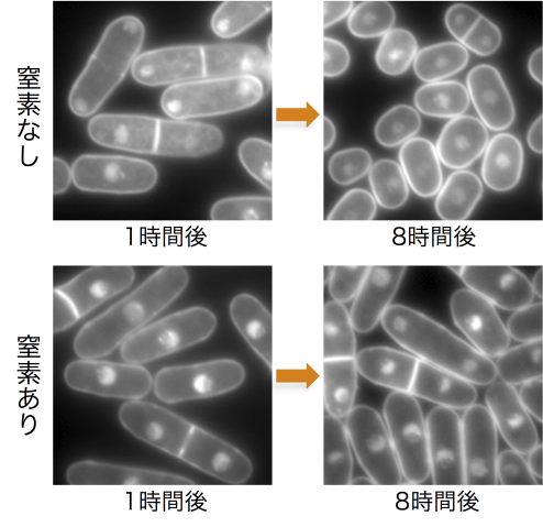 When nitrogen sources run out, fission yeast’s growth dramatically slows: The fission yeast divides only twice in the subsequent eight hours or so, and completely stops growing or dividing when its cells reach half their regular size.