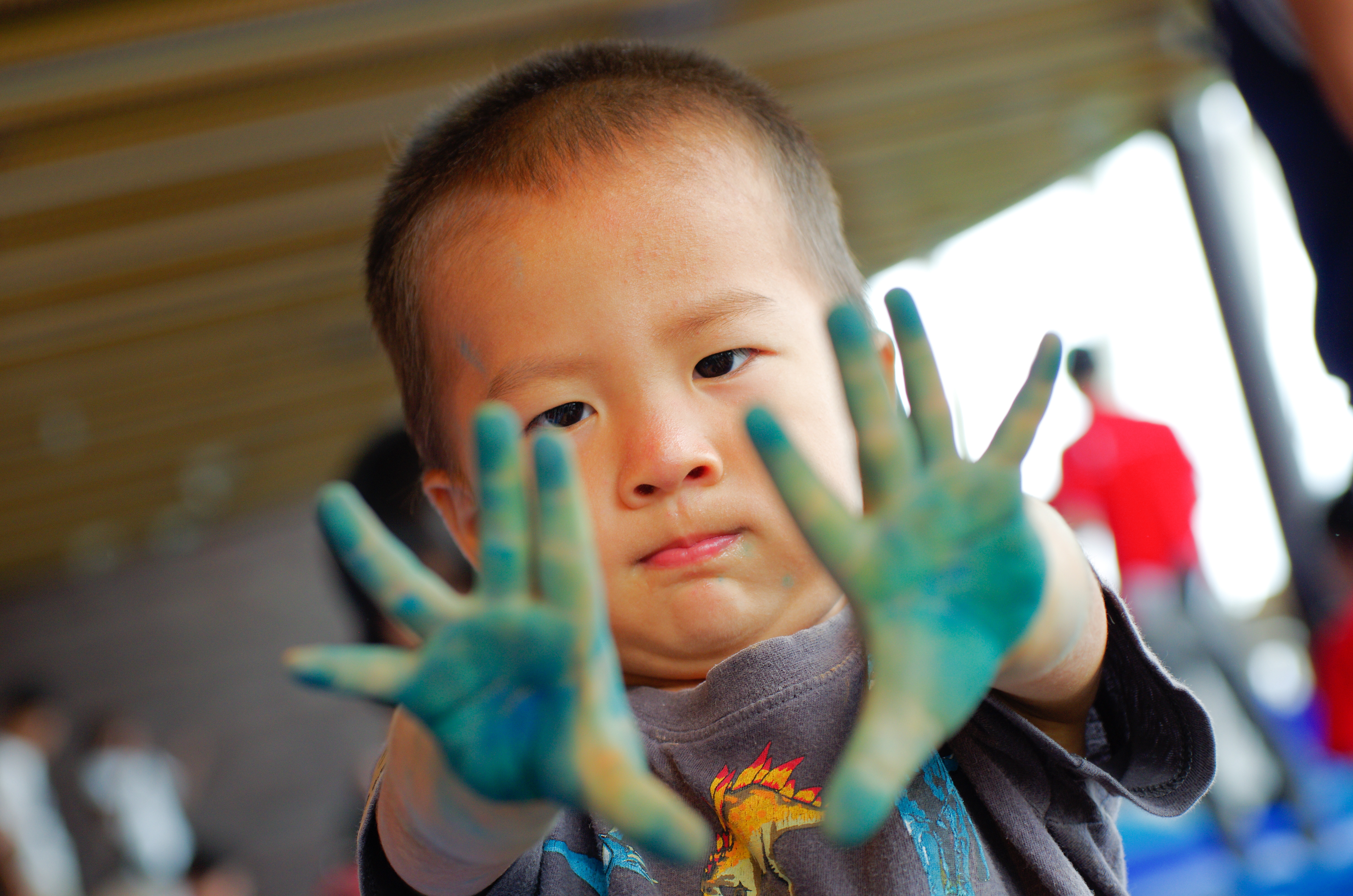 A boy shows how he has used his hands to paint the whale mural.