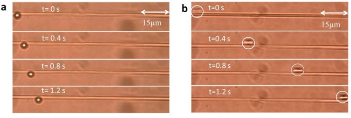 A three micron polystyrene particle (white dot or circle) is propelled along a microfiber by light in the fundamental mode (left) and a higher order mode (right). The particle moved eight times faster under the higher order mode, which is why it is much farther along the fiber and appears longer because it is moving faster than the camera can capture.