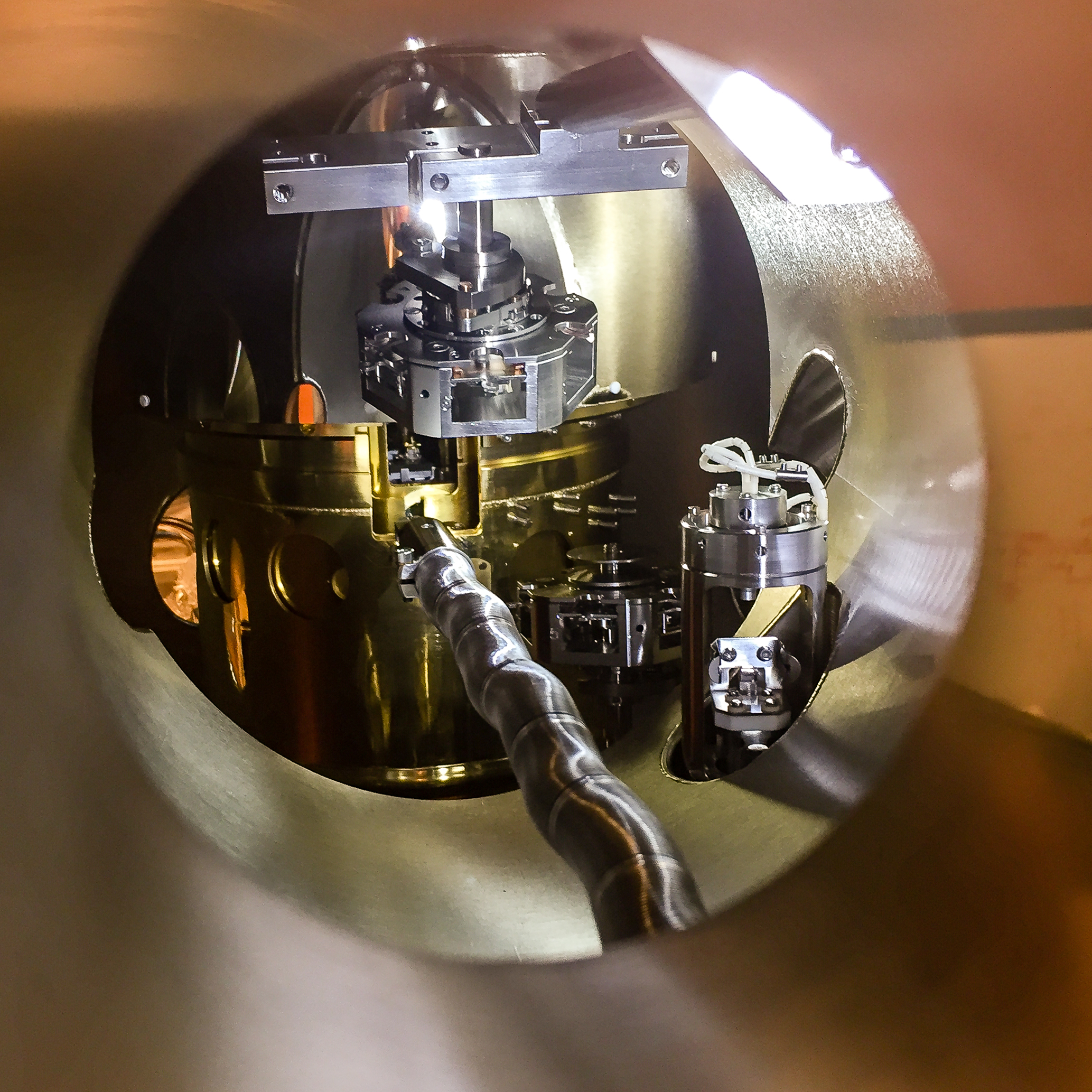 Inside view of the scanning tunneling microscope. The yellow cylinders are the heat shields, behind which samples get cooled.