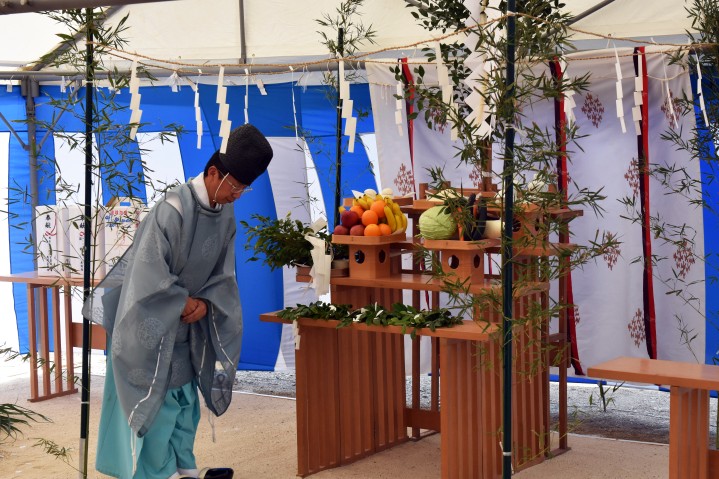 The Kannushi (Shinto Priest) conducting the ceremony in front of the altar.