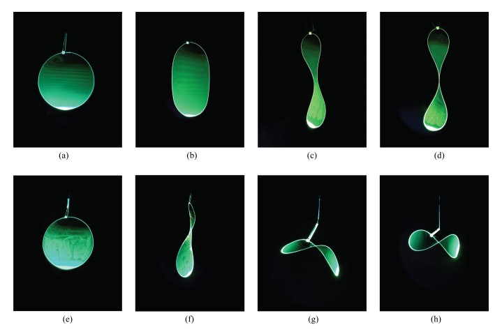 The figure above shows loops with soap films spanning them. If the loops are sufficiently small they remain circular (a). As the length of the loop increases from (b) to (d) the initially circular shape becomes unstable and it begins to gradually warp into a dumbell-like shape due to other energies such as surface tension overtaking the loops rigidity. In pictures (e) through (h) the loops do not change lengths and are all the same as the circular loop in picture (a). They demonstrate the destabilizing effect of twisting, with each successive loop imparted with more twist.
