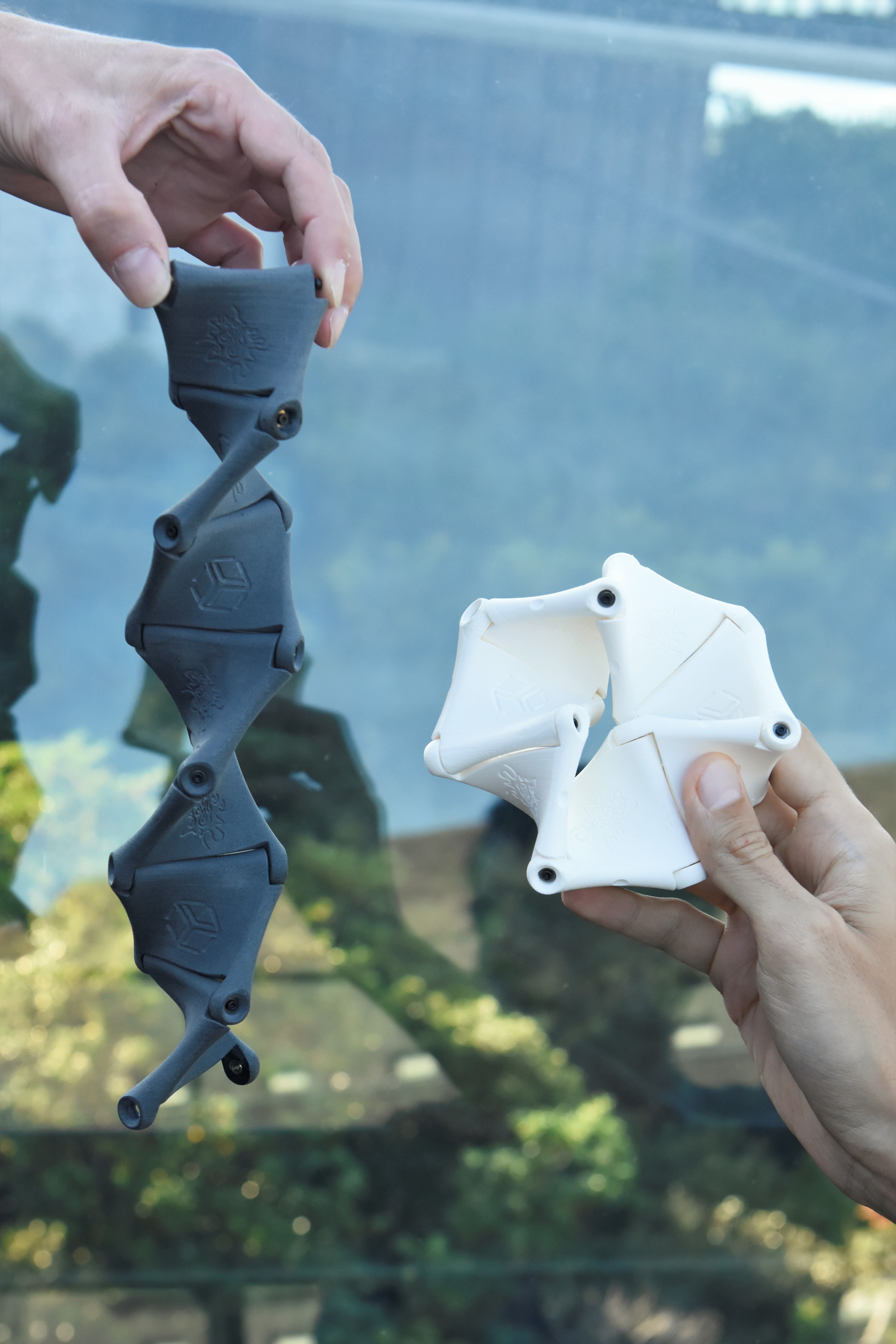 Dr. Johannes Schönke and Prof. Eliot Fried have introduced a new class of kaleidocycles, which have seven or more hinges. One of the researchers’ main challenges was learning what conditions had to be met for a chain of seven or more pyramids (left) to be closed into a ring (right).