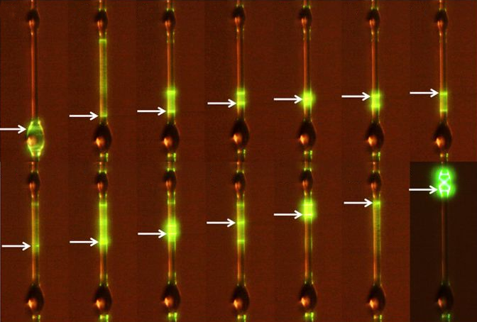 A thin coating (around one micron thick) is formed on the capillary. Laser light can be created at almost any point on the capillary, indicated by the white arrow. The thin coating allows for the fabrication of much smaller microlasers.
