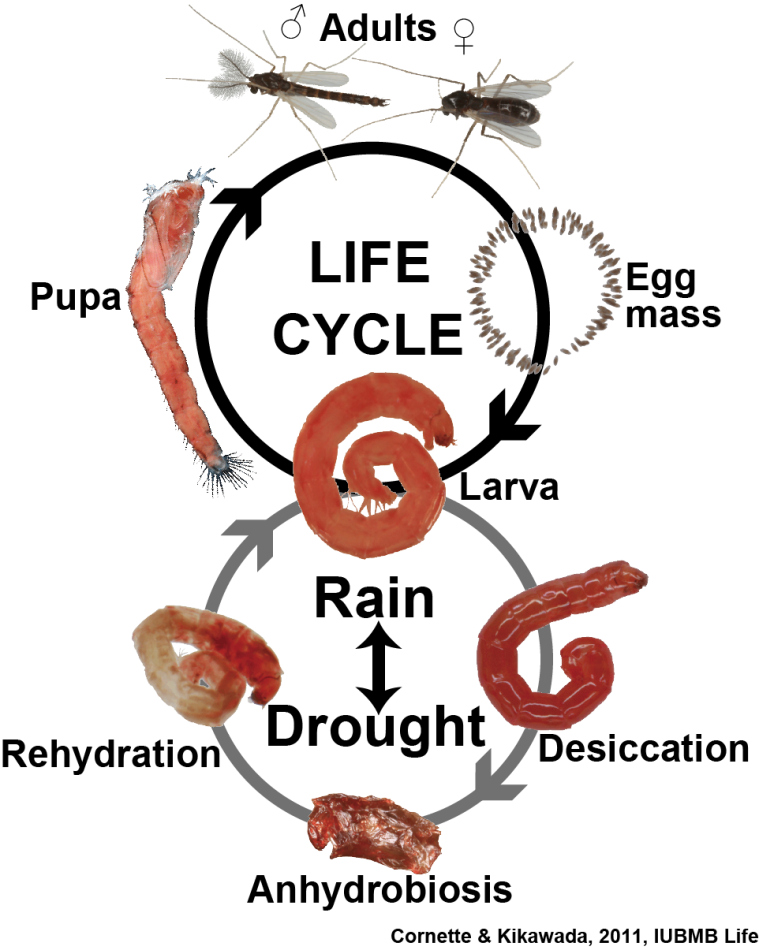 The flow chart shows the different cycles the midge takes through cycles of long drought in Africa. The reintroduction of water into the environment triggers the switch between cycles where seemingly mummified larvae can come back to life.