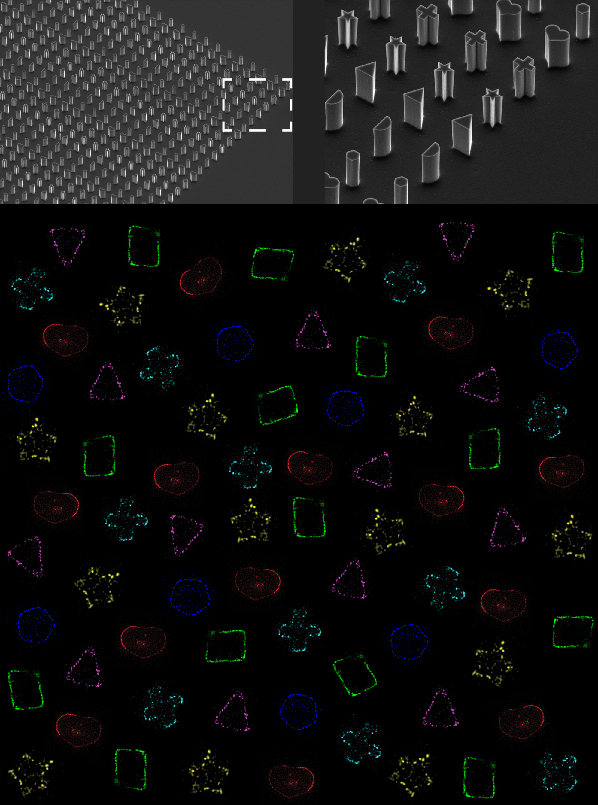 Top: Magnified view of the microfabricated bacteria molds in various shapes. Bottom: Super-resolution fluorescence microscopy images reveal the molded shapes of bacterial Z-rings (montage, pseudo-colored).