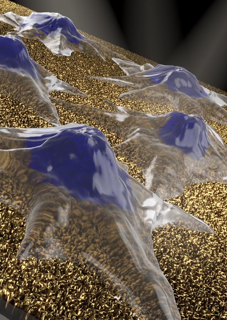 Schematic illustration of cells (blue mountain-like shapes) on top of nanoscale mushroom-like structures with silicone dioxide stems and gold caps, which have the potential to detect cell proliferation in real-time.